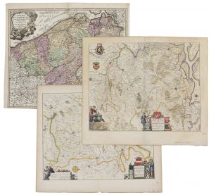 – Een paar 17de–eeuwse en deels ingekleurde kaarten van het hertogdom Brabant en het markiezaat Antwerpen door Flor A Langren, uitgegeven in Blaeu's 'Grooten Atlas', getiteld 'Prima – Tertia pars Brabantiae', ca. 1640. Versierd met wapen, legende en titelcartouche.