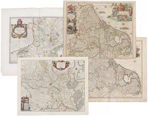 Provinces du milieu du XVIIe siècle, frontières coloriées, titrée 'XVII Provinciarum Germaniae Inferioris Tabula', par Frederik De Wit. 480 x 555 mm – Carte des 17 Provinces de la fin du XVIIe siècle, frontières coloriées, titrée 'XVII Provinciarum Belgicarum', publiée par Carel Allard, datée 1675. Déchirure. 470 x 560 mm – Carte du duché de Limbourg du milieu du XVIIe siècle, frontières coloriées, titrée 'Ducatus Limburgum' par Aegidius Martinus, publiée par Blaeu, 1635. 385 x 500 mm Tot. : 4 ex.