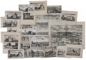 – 19 vues gravées de château et d'abbaye de 'Castella et praetoria' de Jacques Le Roy et oeuvres de Sanderus, petites dimensions, – Vue sur Prague (titrée 'Prag die Hauptstadt des Königreichs Böhmen', gravée par Bodenehr, 170 x 300 mm). Tot. : 21 ex.360 x 480 mm
