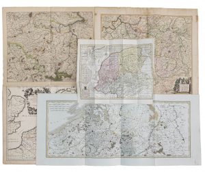 Frederik De Wit, vers 1681–1700. 460 x 545 mm – Carte avec frontières colorées des Provinces Unies par Hubet Jaillot de la fin du XVIIe siècle, titrée 'Les Dix–Sept Provinces des Pays–Bas', datée 1675. 440 x 570 mm – Carte de Brabant partiellement coloriée de la fin du XVIIe siècle. 410 x 510 mm – Carte coloriée de la région entre Cologne et la Mer du Nord de la fin du XVIIIe siècle. 335 x 850 mm ─ On joint : – Petite carte coloriée de France, datée 1782. Tot. : 5 ex.