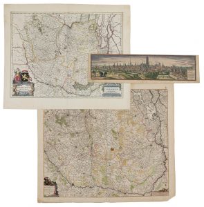 Une carte gravée et coloriée aux limites du Duché de Brabant du début du XVIIe siècle, titrée 'Brabantia ducatus', publiée par Willem Blaeu, vers 1630. 385 x 500 mm – Une carte gravée et coloriée de la fin du XVIIe siècle, titrée 'Tabula ducatus Brabantiae', publiée par Nicolas Visscher, vers 1680. 475 x 555 mm Tot. : 3 ex.
