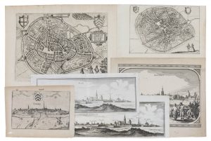 Johannes Peeters de 'Topographia circuli Burgundi' dans 'Topographia Germaniae Inferioris' d Caspar Merian, 1654. L'un est bon, l'autre a un empreinte pâle. 115 x 335 mm (x 2) – Une vue gravée panoramique sur Aarschot provenant de 'Theatrum praecipuarum urbium ducatus Brabantiae necnon comitatum Flandriae et Zelandiae' de Pieter Hendricksz. Schuts, publiée par N. Visscher, 1656. 210 x 275 mm – Et deux autres vues sur Lierre et Tirlemont. Tot. : 6 ex.
