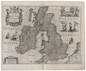■ (GREAT BRITAIN/ IRELAND) — An early–17th century engraved map of Great Britain and Ireland, titled 'Magna Britanniae et Hiberniae tabula' by Henri Hondius, dated 'Amsterdam 1631', published in Blaeu's 'Le Théâtre du Monde ou Nouvel Atlas', 1645. — Decorated with big title and scale cartouche and inserted map of the Orckney Islands. 380 x 515 mm (445 x 540 mm)