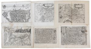 – Een lot van twee laat 16de–eeuws gegraveerde kaartjes van het hertogdom Brabant en het graafschap Henegouwen gegraveerd door H. Nagel en uitgegeven door J. Bussemacher in 'Europae Totius Orbis Terrarum Partis praetantissimae, Universalis et Particularis Descriptio', getiteld 'Brabantiae Belgarum provinciae' en 'Nobilis Hannoniae comitatus descriptio', ca. 1581–1600. 180 x 265 mm (x 2)