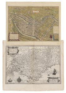 (FRANCE–LYON) — Un lot de deux cartes gravées de la fin du XVIe siècle : – Une vue sur Lyon et environs, coloriée, titrée 'Lugundum', de 'Civitates Orbis Terrarum' de Braun & Hogenberg, 1572. 335 x 480 mm – Une carte du sud de France,...