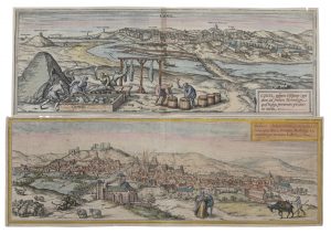 ■ (SPAIN–BURGOS/ CONIL DE LA FRONTERA) — A pair of early–17th century engraved and coloured sights of Conil and Burgos after Joris Hoefnagel and (presumably) Anton van den Wyngaerde, from Braun & Hogenberg's 'Civitates Orbis Terrarum, Liber Primus–Secundus', Cologne, 1593–1623. 160 x 460/ 160 x 470 mm