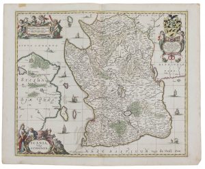(SUÈDE) — Une carte gravée et coloriée de Suède de la fin du XVIIe siècle par Johan Janssonius, titrée 'Scania vulgo Schonen', publiée dans 'The English Atlas', chez Moses Pitt, 1680.