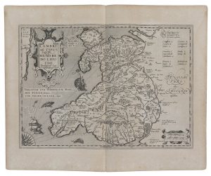 ■ (WALES) — Een vroeg 17de–eeuwse gegraveerde kaart van Wales door Gerard Mercator, getiteld 'Cambriae Typus auctore Humfredo Lluydo Denbigiense Cambro britanno', gegraveerd door Pieter Vanden Keere, uitgegeven in de Atlas van Hondius, ca. 1613–16.