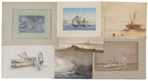 Scène de plage à Calais. Crayon, lavis d'encre. 180 x 265 mm – Frantz, Scène de plage avec pêcheurs. Aquarelle, encre brun. Une paire. Signée 'Frantz'. 220 x 320 mm (x 2) – trois autres dessins du XIXe siècle. Tot. : 7 ex. 175 x 250 mm