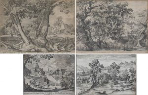 En twee andere kleine 17de–eeuwse gegraveerde landschappen w.o. 'October' (uit Twaalf Maanden–reeks). 130 x 190/ 140 x 170 mm.
