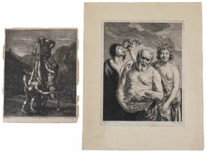 ca. 1658. — On joint : – Schelte Adams Bolswert (1586–1659) d'après Jacques Jordaens (1593–1678).— Silène avec vendangeoir, entre Zephyr et Flora. — Gravure sur cuivre. — Signée dans la planche. — Collée sur support, un peu de repérage. 345 x 275 mm Tot. : 2 ex. 315 x 255 mm