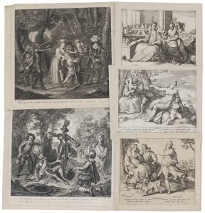 Een lot van drie allegorische voorstellingen van de tast–, reuk–en smaakzin (uit de reeks 'De Zintuigen').