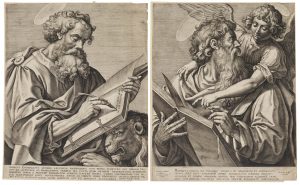 HIERONYMUS WIERIX (1549–1615) — Les évangélistes Mattheus et Marcus. — Gravure sur cuivre. Lot de deux. — Signée dans la planche 'Jeronimus Wierix sculptor/ Martinus De Vos inventor' et 'Mart. de Vos inven. Jero. Wierix scul', les deux...