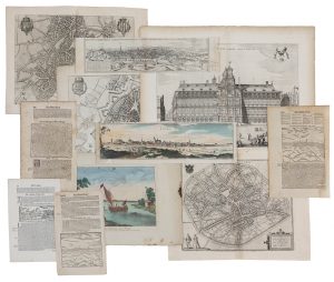 plans gravés de Malines et Tirlemont de Giuccardini, vers 1582. 335 x 460 mm (x2) –) Deux vues gravées sur Louvain, de la fin du XVIe siècle, provenant de 'Civitates Orbis Terrarum' de Braun et Hogenberg, 1599. 115 x 475 mm –) Un plan gravée de Malines du milieu du XVIIe siècle, avec figure allégorique de la Justice sur cartouche de titre, publié par Blaeu, vers 1649. 385 x 500 mm –) Une vue gravée et colorée sur Louvain, du milieu du XVIIe siècle, par Caspar Merian, provenant de 'Topographia Germaniae Inferioris', 1659. Restauration au bas de la marge. 140 x 510 mm –) Une vue gravée sur l'hôtel de ville d'Anvers du milieu du XVIIe siècle, provenant de 'Stedeboeck' de Blaeu, 1649. 390 x 535 mm –) Une vue d'optique colorée de la fin du XVIIIe siècle, titrée 'Vue des environs de Mons'. 250 x 350 mm Tot. : 11 ex.
