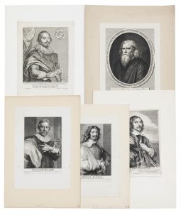 2–3. Jan–Baptist Barbé et Adriaan Brouwer, par Schelte a Bolswert (1586–1659), provenant de 'Iconographia' d'Antoon Van Dyck. 245 x 160 mm (x 2) – 4. Frederick de Marselaer par Adrien Lommelin (vers 1637–1675), d'après Antoon Van Dyck. 275 x 200 mm. – Et autre (en réimpression). Tot. : 5 ex.