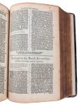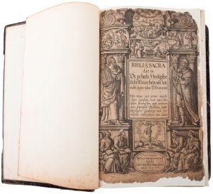 ■ (BIJBEL) — Biblia Sacra. Dat is de geheele heylighe Schrifture bedeylt int Oudt en Nieu Testament. Van nieus met groote neesticheyt oversien, ende naer den lesten Roomschen text verbetert, door sommighe Doctoren inder Heyligher Godtheyt inde vermaerde Universiteyt van Louen. Antwerpen, Jan Moerentorf en Jan Van Keerberghen, 1599. In–fol. Gegraveerde titel (beschadigd).