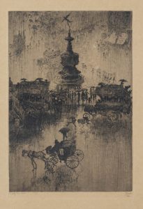 JULES DE BRUYCKER (1870–1945) — 'Picadilly Circus Londres'. — Eau–forte sur simili–Japon. — Signée, numérotée et titrée à la mine de plomb. — Encadrée. — 485 x 325 mm (670 x 500 mm)