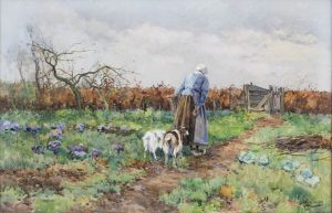 VICTOR WAGEMAEKERS (1876–1953) — Paysanne avec des chèvres dans un champ de chous. — Aquarelle sur papier sur toile. Signée 'V. Wagemaekers'. — Enacdrée. — 640 x 1000 mm (810 x 1150 mm)