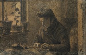 MODEST HUYS (1874–1932) — Dentellière, 1912. — Fusain sur papier. Signé et daté 'M Huys/1912'. — Encadré. ─ Expo : – 1999, Museum van Deinze en de Leiestreek, exposition Modest Huys, cat. nr. 94 260 x 405 m (490 x 635 mm)