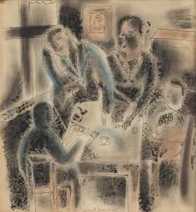 WOUT HOEBOER (1910–1983) — La soirée, 1937. Encre noire et aquarelle. Signée 'Wout Hoeboer'. Etiquette de l'artiste avec titre et date au verso. Encadrée.260 x 240 mm (530 x 510 mm)