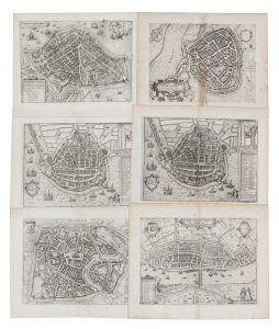 ■ (Nederland) Een verzameling van zes vroeg 17de–eeuwse gegraveerde plattegronden uit Guicciardini's 'Beschryvinghe van alle de Nederlanden', uitgegeven door Willem Blaeu, ca. 1612 :