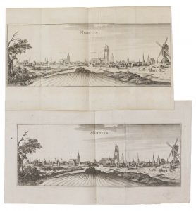 ■ (MECHELEN) — Een lot van twee identieke midden 17de–eeuws gegraveerde panoramische gezichten op Mechelen door Matthäus Merian (1593–1650).