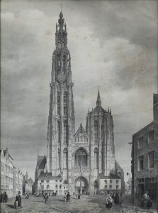 GUSTAVE SIMONAU (1810–1870) — Cathédrale d'Anvers, 1843. — Lithographie. Signée et datée dans la pierre 'Gve Simoneau/ 1843'. — Rousseurs. Encadrée. — 625 x 465 mm (775 x 605 mm)