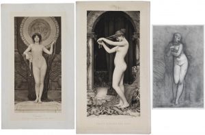 JOHN WILLIAM GODWARD (1861–1922) – (d'après) — 'Venus binding her hair'. 'Campaspe'. — Héliogravure sur Chine collé. — Lot de deux. — Publiées à Londres, 1897–98. — Sur support. ─ On joint : – Georges Bellenger (1847–1918)...