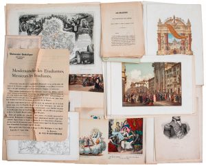 Lier, Bruxelles e.a. "La rue de Madeleine en 1825" 350 x 1400 mm), France (Strasbourg, Côte d'Or, Hôtel de l'Assay en aquatinte couleur), Rome (avec 26 lithographies en couleur pour "Concile œcuménique 1869"), Amsterdam, etc. ─ Ci–joint : – Michel Plonski (1778/82–1812), Chien. Portrait. Le destin de deux gravures. ─ Et d'autres encore. Tot. : ca. 88 ex.