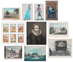 En gezichten op Hamburg, het kasteel van Koningshooikt, een 18de–eeuwse ingekleurde opticaprent van Nürnberg, Liebig–chromo's, een 'mater dolorosa' (aquarel), 'un derrière de diligence' en twee 18de–eeuwse ingekleurde modeprenten. Alle in kader.