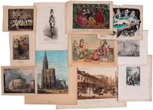 ■ (DECORATIVE GRAPHICS) — An extensive set of decorative prints including caricatures ('Tribulations Van der Snuyf', 'Milan commission' by George I Cruikshank (1792–1878), work by Honoré Daumier (1808–1879)), five Ghent porcelain cards, suite 'Les beautés architecturales de Londres', etc.).