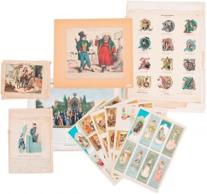 ■ (DECORATIVE GRAPHICS) —An extensive collection of decorative prints including views of Antwerp, slave market in Suriname (by Madou), battle of Waterloo, 'Mosque of Sultan Achmet' (color aquatint by Luigi Mayer (1750–1803)), chromolithos De Beukelaer and others , caricatures, 'Ordres religionux costumes d'hommes / de femmes' (550 x 715 mm (x 2)).