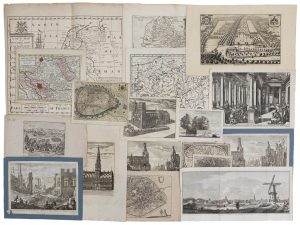 ■ (VLAANDEREN–BELGIË) — Een gevarieerd lot historische topografie uit de 17de–18de eeuw met o.a. twee plattegronden van Brussel (w.o. één ingekleurd), twee kaartjes van Mechelen en omgeving, een zicht en twee plattegronden van Tienen, 'A new map of the Netherlands or Low Countries', voorts kaarten van Luxemburg, Artesië en zes belegeringen (Tienen, Kallo, Nieuwpoort, Dendermonde, Aalst en Oostende) en pittoreske zichten op Geraardsbergen, Utrecht, de Antwerpse Beurs, vier zichten op historische gebouwen in Amsterdam, etc.
