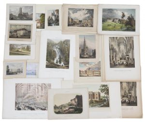 ■ (DECORATIEVE TOPOGRAFIE) — Een omvangrijk geheel 19de–eeuwse prenten (litho, chromolitho, sommige gehoogd met aquarel en gegomd, aquatint) met zichten te Brussel, Amsterdam, Antwerpen ('Reddition de la citadelle d'Anvers', 'Théâtre d'Anvers'), omgeving Antwerpen (Hingene, Basel), Mechelen ('Het spoorwegstation'), Vinderhoute en Ameronghen (uit Goethgebuer), Doornik, Brugge, Braine l'Alleud ('Hôtel des Colonnes'), Leuven, Westmalle ('Couvent de la Trappe'), Bergen, Namen, Engeland, Frankrijk, etc.