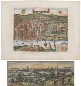 ■ (FRANKRIJK–ROUEN–TOURS) — Een lot van twee laat 16de–eeuwse gegraveerde en ingekleurde gezichten in vogelperspectief op Tours en Rouen, resp. getiteld 'Turones vulgo Tours, le Iardin de France' en 'Rhotomagus', uit Braun & Hogenbergs 'Civitates Orbis Terrarum', 1585–96.