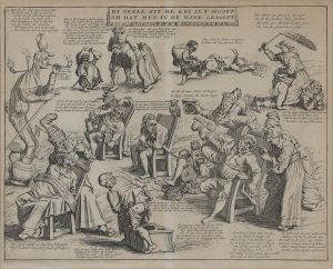 ■ An anonymous early–18th century engraved caricature, titles 'By veele zit de kei in't hooft om dat men in de wind gelooft' from 'Het groote tafereel der dwaasheid' (1720). Framed.