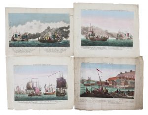 (opticaprenten) Een verzameling van vier midden tot laat 18de–eeuwse opticaprenten met o.a. zicht op 'Salem' (gegraveerd door Balthasar Friedrich Leizelt) en drie zeeslagen.