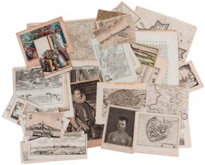 ■ (Decorative topography Belgium) — An extensive lot of 16th–18th century prints depicting plans, battles, maps, panoramic views, castle views, etc. — Some colored.