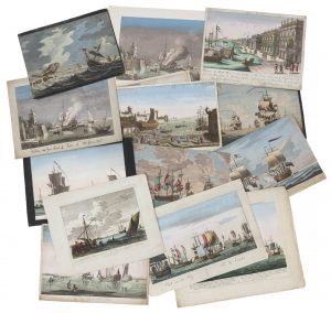 ■ (Opticaprenten) — Een verzameling van 14 midden tot laat 18de–eeuwse ingekleurde opticaprenten w.o. 'Gesigt op de Flaamse Kunst' (door Hendrik Spilman (1721–1784) naar ontwerp van Van Goyen, uitgegeven te Amsterdam door Samuel Cruys), zeeslagen (w.o. 'Combat entre les Fregates Hollandaises et les Fregates Anglaises'), brandend schip bij Messina (dubbel), een scheepswerf, een 'Vue de la mer au soleil couchant', etc.