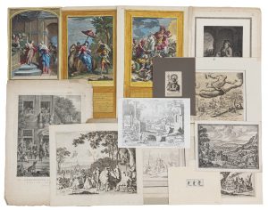 marges), Jan Collaert d'après Tobias Verhaecht ('Aetas ferrea', 200 x 260 mm), Adam Bartsch d'après Raymond Le Fage (Crucifiement de Pierre, eau–forte, daté 1783, 270 x 310 mm), Pelleter d'après Cornelis Troost ('L'ambassadeur des Labberlots', 400 x 300 mm), deux estampes de Jacques Callot, trois représentations bibliques colorées (publiées par Mariette), et cetera. • Tot. : 13 ex.