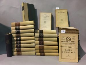 BULLETIN DU BIBLIOPHILE. P., 1861 (demi-toile bleue moderne), puis 1922-1959. Relié en 18 vol. in-8 toile beige époque de 1922 à 1938, ensuite en fascicules brochés. On joint : - BULLETIN DU BIBLIOPHILE. Table générale 1834-1906 par G. Vicaire....