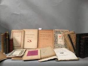Un carton de catalogues de ventes de bibliothèques XIXe et début XXe s., formats variés, reliés ou brochés, dont bibliothèques Laborde, Rochebilière, et dont : Catalogue des livre de la bibliothèque de Messieurs du Châtelet, P., Boudet,...