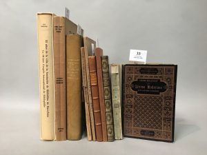 Description de... 220 ouvrages rares curieux ou singuliers. P., s.d., [vers 1880], in-8 demi-basane moderne, dos insolé. XV-176 pp., 44 planches h.-t. Un des 100 ex. sur papier de luxe. - BOUCHOT (H.). Des livres modernes qu'il convient d'acquérir. L'art et l'engouement, la bibliofolie contemporaine, les procédés de décoration. P., 1891, in-12 broché. 100 pp. ill. - RICCI (S. de). Bibliographie des publications d'Anatole Claudin. 1833-1906. in-8 br. Londres, Maggs, 1926. 111 pp. Tiré à 100 ex. - NOTES D'UN AMATEUR sur les livres illustrés du XVIIIº siècle par M. M*** P***. P., 1926, in-8 broché, 143 p., dos cassé. (Extr. du Bull. du Bilio.). Tiré à 170 exemplaires. - MORTET (Ch.). Le format des livres. Notions pratiques suivies de recherches historiques. P., Champion, 1925, in-8 broché. 60 pp. 4 planches. - STUDIO (The). The Art of the Book. L., 1914, in-4 broché, 275 pp.-nbr. ill. dans le texte et h.-t. - BARCELONE. IIIème congrès international de bibliophilie. 1963. Actes et communications. In-4 br. 212 pp. Sous étui. - RICHARD (J.). L'art de former une bibliothèque. P., 1883, in-8, demi-veau vert. 156 pp. Sur vergé. - LABESSADE (L.F. de). L'amour du livre. P., 1904, in-8, demi-chagrin. 108 pp. Tirage limité à 60 ex., un des 50 sur sur papier vélin. Soit 10 volumes.