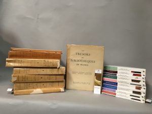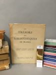 planches h.-t. dont une trentaine en couleurs et reproduisant des dessins, des reliures, des estampes et des fac-similés d'autographes. Il manque à notre exemplaire les deux premiers fascicules de 1946. On joint : - PATRIMOINE DES BIBLIOTHÈQUES DE FRANCE. P., 1995 10 [sur] 11 volumes dont un index (manque le tome 4), in-8 br. Près de 3000 pp., abondante iconographie en noir et couleurs. - NEVEUX & DACIER. Les richesses des bibliothèques provinciales de France. Tome 2 : Lyon - Yvetot. P., 1932, in-4 br. Soit 20 volumes.