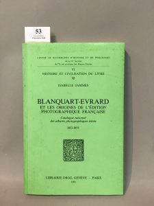 JAMMES (I.). Blanquart-Evrard et les origines de l'édition photographique française. Catalogue raisonné des albums photographiques édités. 1851-1855. Genève, 1981, in-8 br. (rouss. sur la couv.) 325 pp. ill. (Hist. et civil. du Livre 12).