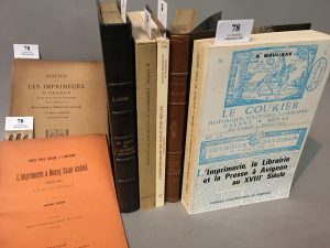 régime 1700-1789. 1958, in-8 br. 288 pp. - LANÇON (P.). L'édition rouergate aux XVIIe et XVIIIe siècles. Répertoire bibliographique. Rodez, 1991, in-8 br. 424 notices. ill. (Archives historiques du Rouergue XXII). - BILLIOUD (J.). Le livre en Provence du XVIe au XVIIIe siècle. Marseille, 1962, in-8 demi-chagrin à coins, tête dorée 300 pp. - MOULINAS (R.). L'imprimerie, la librairie et la presse à Avignon au XVIIIº siècle. Grenoble, 1974, in-8 broché. 441 pp. - MILLET (M.). Notice sur les imprimeurs d'Orange et les livres sortis de leurs presses avec un appendice sur les écrits relatifs à l'histoire de cette ville. Valence, 1877, in-8 broché. 75 pp. - STEIN (H.). Notes pour servir à l'histoire de l'Imprimerie à Bourg-Saint-Andéol au XVIIIe siècle. Besançon, 1911, in-8 br. Soit 7 volumes.