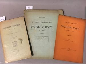 1905, in-8 br., 16 p. (Extr. du Bibliographe moderne). 55 - STEIN (H.). L'atelier typographique de Wolfgang Hopyl à Paris. Gand, 1891, in-4 br., 30 pp. Soit 3 volumes.