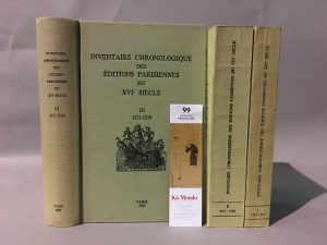 MOREAU (B.). Inventaire chronologique des éditions parisiennes du XVIº siècle... d'après les manuscrits de Philippe Renouard. P., 1972-1985, 3 vol. in-8, les 2 premiers br., le 3e toile éd. (Hist. gén. de Paris). I: 1501-1510. 423 pp.-II:...
