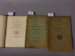 Imprimeurs de Paris (1618-1791). Nimes, Chastanier, 1922, in-8 broché (dos usé). 208 pp. Thèse. - FAUCOU (Lucien). Mémoire sur les vexations qu'exercent les libraires et imprimeurs de Paris. Publié d'après l'imprimé de 1725 et le manuscrit de la Bibliothèque de la Ville de Paris. P., Moniteur du Bibliophile, 1879, in-4, demi-toile. 111 pp. Soit 3 volumes.