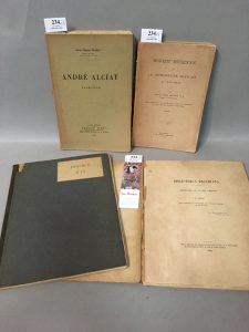 et annotés par Erasme. 67 pp. 3º série : Sources, biographies d'Erasme et écrits le concernant. Edition originale. On joint : - BRANDON (E. E.). Robert Estienne et le Dictionnaire français au XVIe siècle. Thèse Baltimore, 1904, in-8 br. (dos usé) 133 pp. - VIARD (P.-É.). André Alciat. 1492-1550.Paris, Sirey, 1926, grand in-8 br. 390 pp. Thèse. Soit 4 volumes.